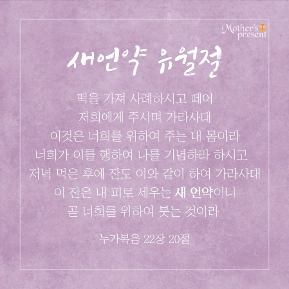 이르시되 내가 고난을 받기 전에 너희와 함께 이 유월절 먹기를 원하고 원하였노라 ··· 또 떡을 가져 사례하시고 떼어 저희에게 주시며 가라사대 이것은 너희를 위하여 주는 내 몸이라 너희가 이를 행하여 나를 기념하라 하시고 저녁 먹은 후에 잔도 이와 같이 하여 가라사대 이 잔은 내 피로 세우는 새 언약이니 곧 너희를 위하여 붓는 것이라 (누가복음 22:15~20)