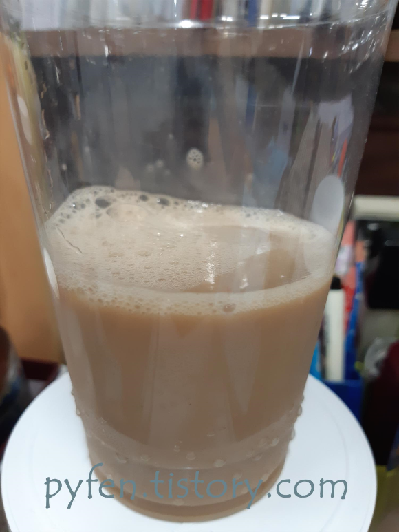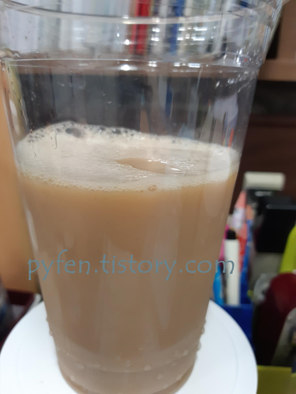 그래서 이렇게 물을 좀 타서 농도를 맞췄어요.