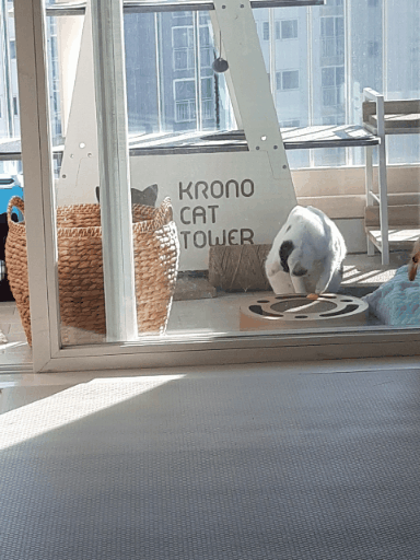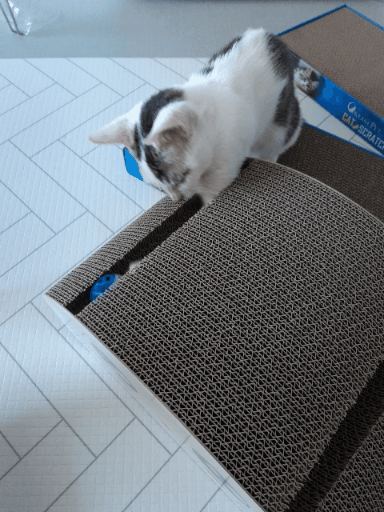그래서 스크레치판을 여기 저기 배치해 놓고 캣타워도 베란다에 배치해 놓았어요.