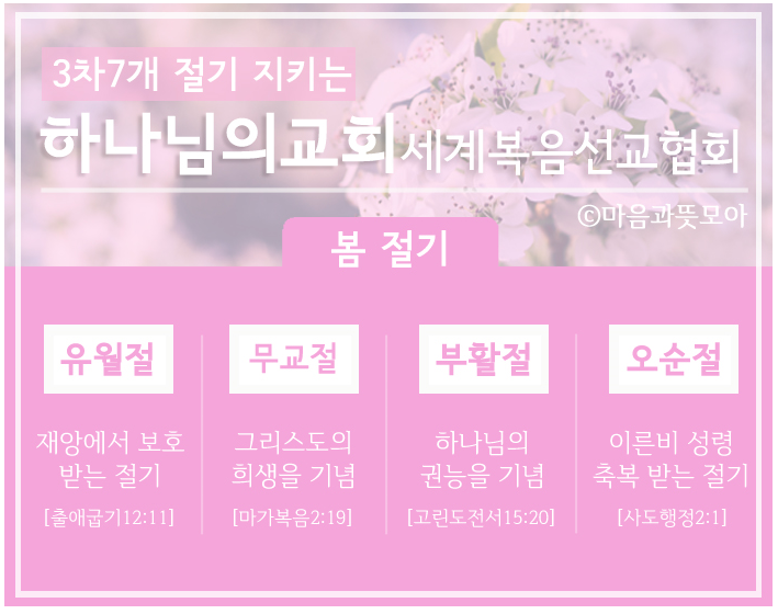 하나님의교회에서 전하는 하나님의 절기와 계명을 들을 분들중 교회를 오래 다닌 분들도 단 한번도 듣지 못했던 하나님의 절기들이 많았다는 얘기를 하곤 합니다.