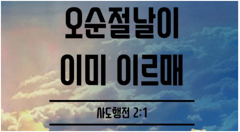 오순절 날이 이미 이르매 저희가 다 같이 한 곳에 모였더니 홀연히 하늘로부터 급하고 강한 바람 같은 소리가 있어 저희 앉은 온 집에 가득하며 불의 혀같이 갈라지는 것이 저희에게 보여 각 사람 위에 임하여 있더니 저희가 다 성령의 충만함을 받고 성령이 말하게 하심을 따라 각기 다른 방언으로 말하기를 시작하니라 (사도행전 2:1~4)