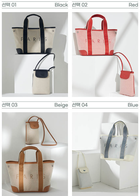 아래 작은 토트백과 크로스핸드폰백은 색깔을 선택할 수 있어요.