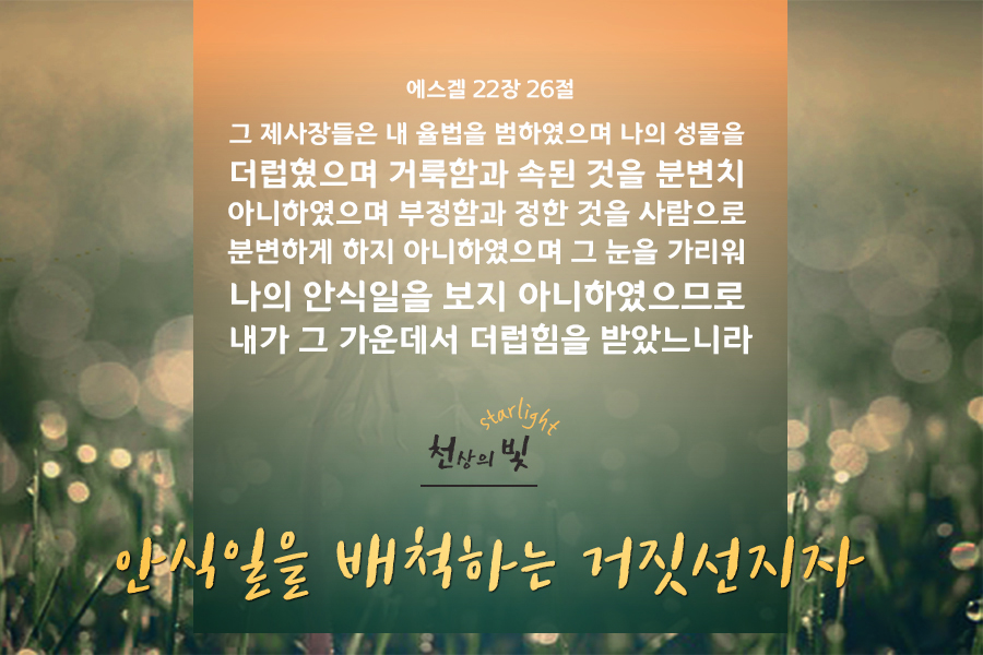 거짓선지자를 알지 못한다면 나도 모르는사이에 거짓과 불법 사람의계명을 지킴으로 재앙가운대로 나아갈 수 있기에 이는 너무나 중요한 문제가 아닐 수 없답니다.