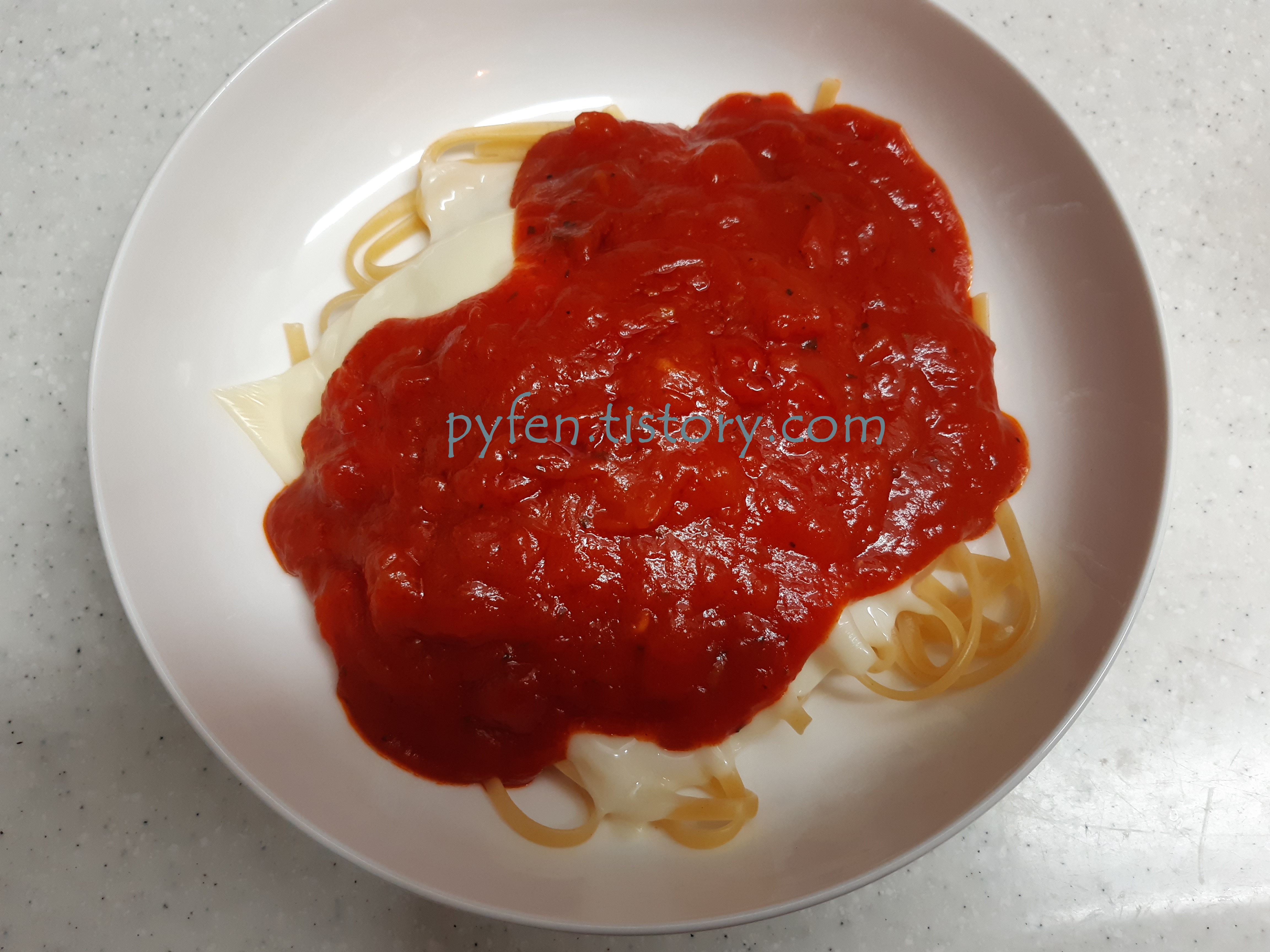 시중에 판매하는 토마토소스를 후라이팬에 데웠습니다.