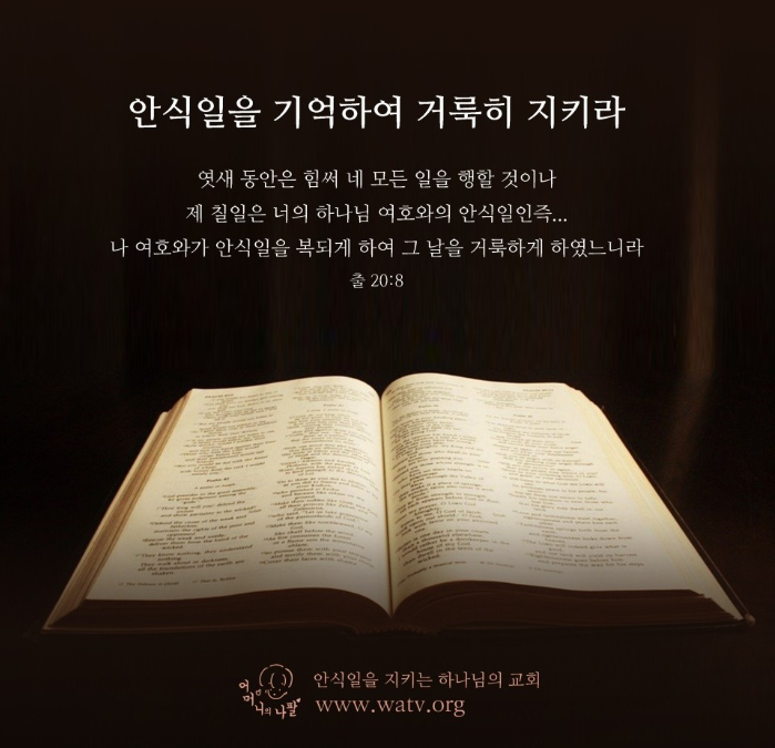 예수님께서 완전케 세워주시고 주후 사도들이 지켜 행하며 증거했던 안식일을 하나님의교회가 신령과 진정으로.. 감사함으로 지켜 행합니다.