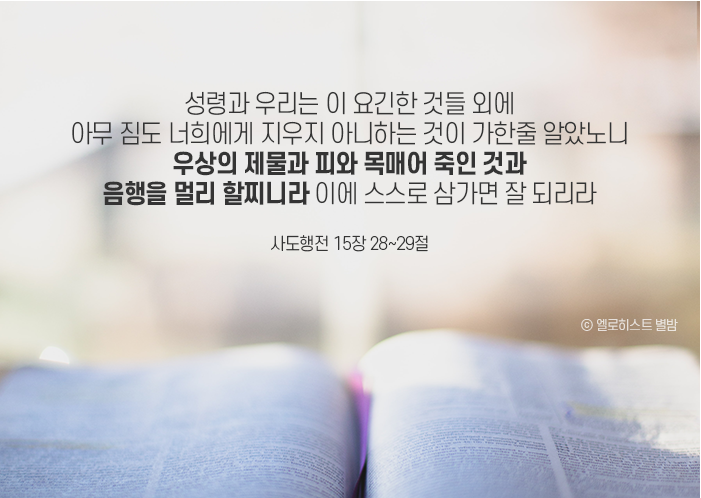 성령과 우리는 이 요긴한 것들 외에 아무 짐도 너희에게 지우지 아니하는 것이 가한 줄 알았노니 우상의 제물과 피와 목매어 죽인 것과 음행을 멀리할지니라 …행 15장 28~29절