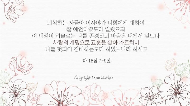막 7:6~9 "가라사대 이사야가 너희 외식하는 자에 대하여 잘 예언하였도다 기록하였으되 이 백성이 입술로는 나를 존경하되 마음은 내게서 멀도다 사람의계명으로 교훈을 삼아 가르치니 나를 헛되이 경배하는도다 하였느니라 너희가 하나님의 계명은 버리고 사람의 유전을 지키느니라 또 가라사대 너희가 너희 유전을 지키려고 하나님의 계명을 잘 저버리는도다"