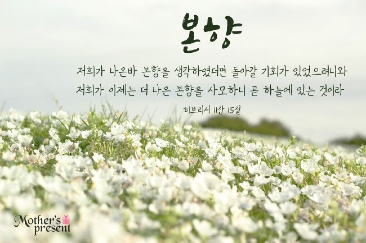 히 11:13 이 사람들은 다 믿음을 따라 죽었으며 약속을 받지 못하였으되 그것들을 멀리서 보고 환영하며 또 땅에서는 외국인과 나그네로라 증거하였으니 이같이 말하는 자들은 본향 찾는 것을 나타냄이라 저희가 나온바 본향을 생각하였더면 돌아갈 기회가 있었으려니와 저희가 이제는 더 나은 본향을 사모하니 곧 하늘에 있는 것이라