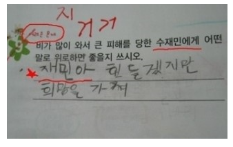 아이가 수재민에 대해 몰랐기에 나온 답이니 모두가 이해해주셨으리라 믿습니다.