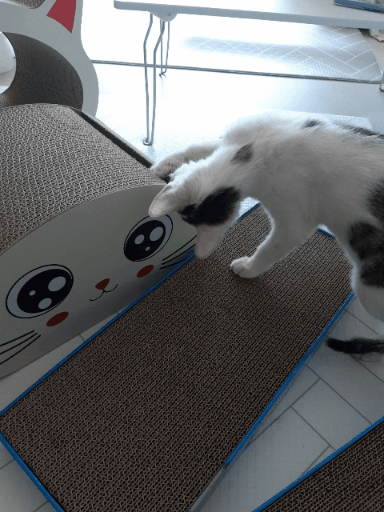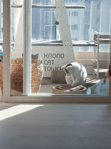 그래서 스크레치판을 여기 저기 배치해 놓고 캣타워도 베란다에 배치해 놓았어요.