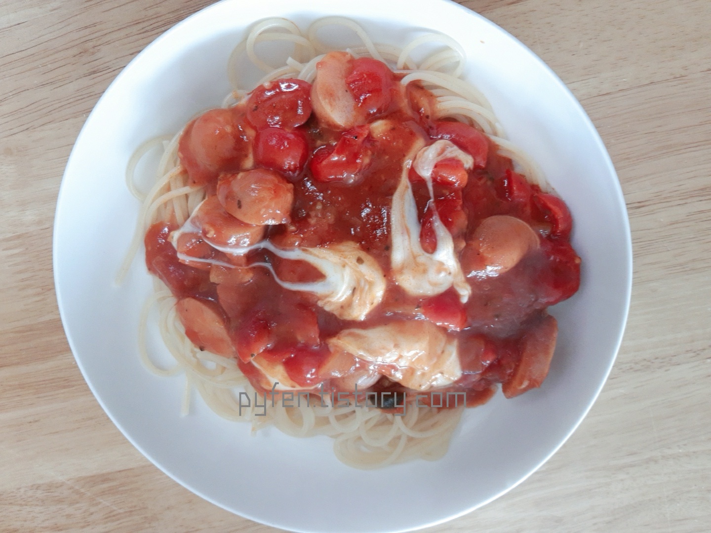 스파게티를 끓일 때 면과 햄을 같이 끓였어요.